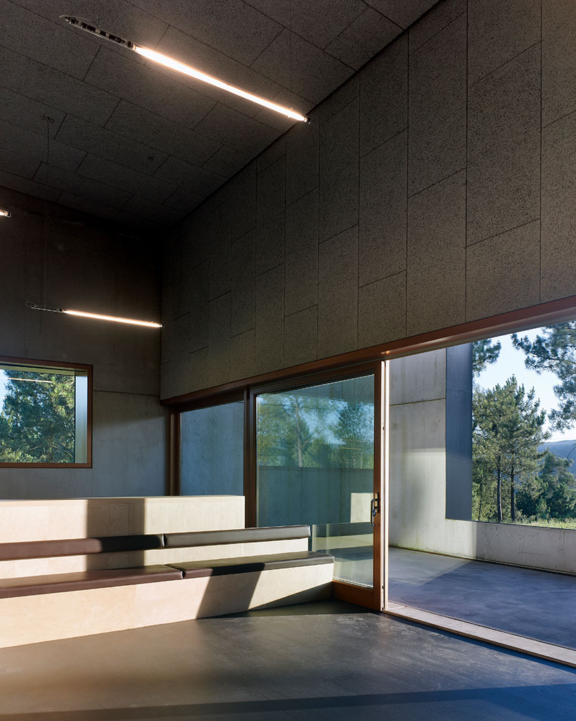 The interior is a shelter made of wood with many small details in solid Canadian cedar wood, and furniture finished in natural veneers.