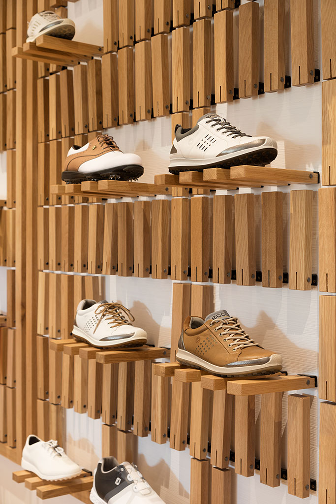 In the centre of the store are cube-shaped podiums, made of oak wood of various sizes and heights, bringing rhythm and dynamism to the whole.