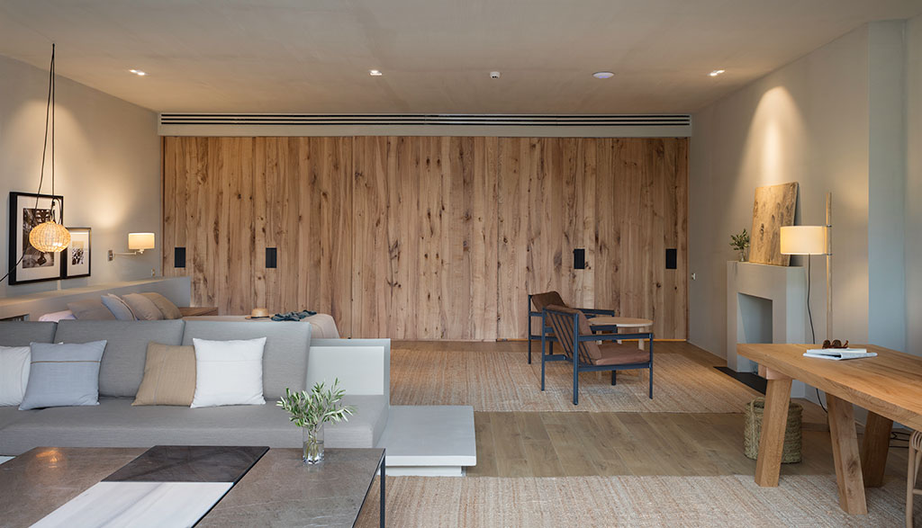 The activity is concentrated in the central bar, which articulates the spaces of the dining room, the terrace and the living room, in which the wool rug designed for this room stands out and the shelves of oak, iron and brass.