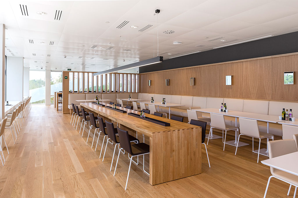 The spaces are sober and modern with wooden walls panelled in oak finishes in the same colour as the floor and the furniture consisting of extremely long tables.