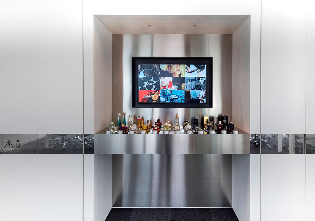 The furniture combines with the steel displays for perfumes and the white furniture for the offices.