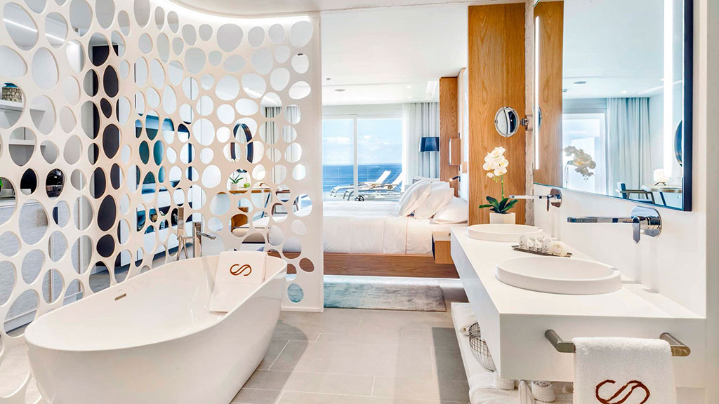 The decorative pieces above the headboards of the beds and the partitions in the form of rounded latticework in the bathrooms have been made in Krion and manufactured in Martínez Otero Composites, our factory dedicated to the transformation of solid surfaces.
