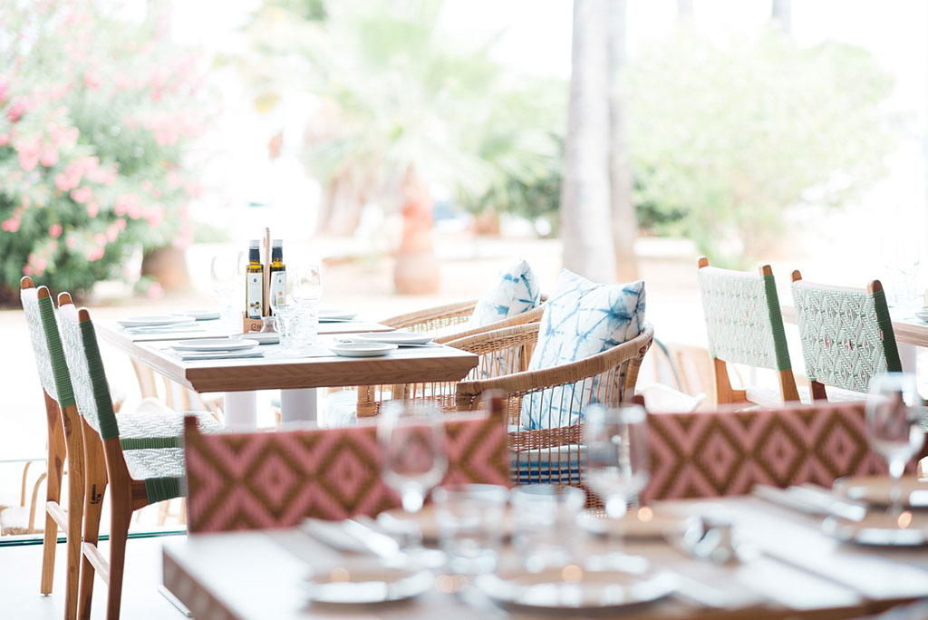 The interior of Salicornia is decorated with a chic beach style in turquoise and white tones. The comfortable rattan chairs are covered with “llengües” fabrics that have been dyed using the Shibori technique, while coral and crystal lamps hang from the ceiling.