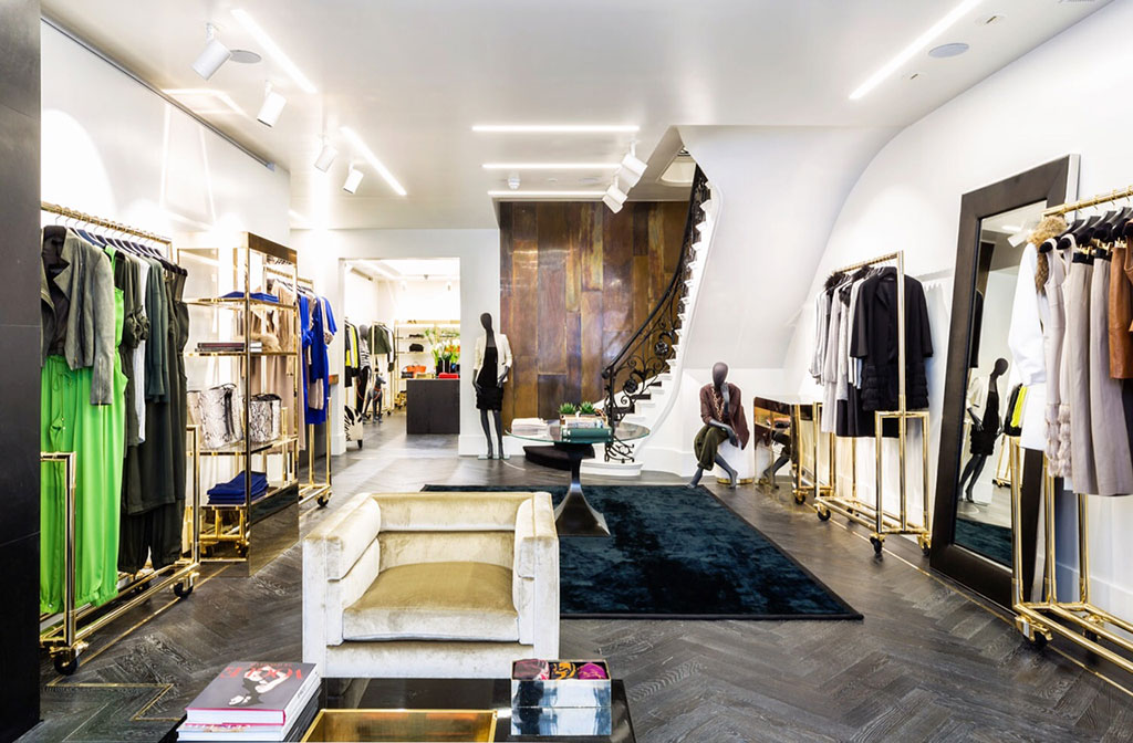 El mismo material, tratado con una pátina se aplicó en los mostradores y el revestimiento de la pared de la escalera que conduce a la colección Atelier en el primer piso.